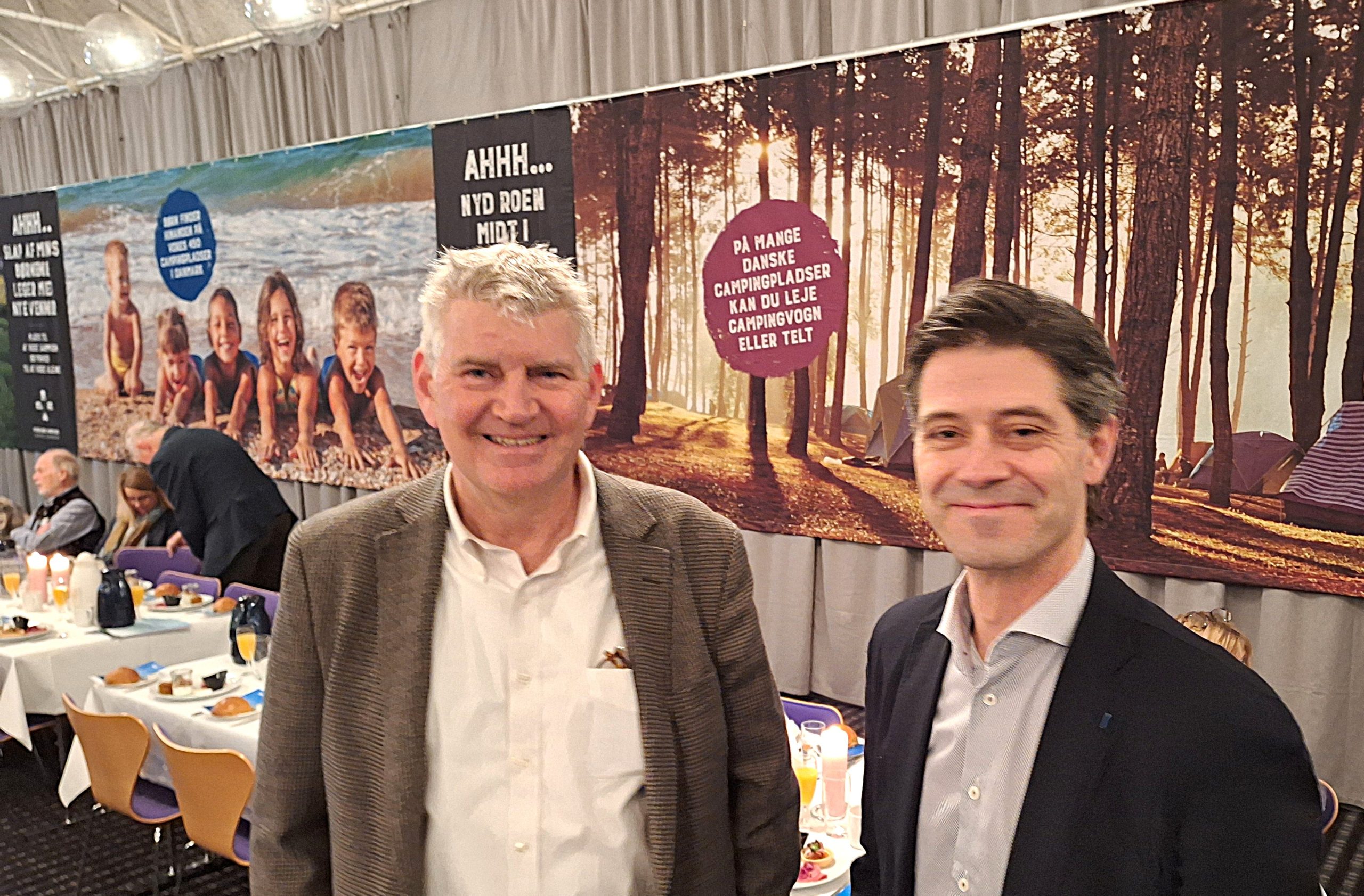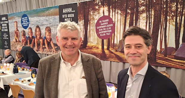 Aller Leisures tidligere koncernchef, Morten Krüger, til venstre, (der også er finansdirektør for Aller-koncernen og formand for Aller Leisure) med sin afløser i Aller Leisure, Simon Pauck Hansen, ved sidste uges Ferie for Alle i Messecenter Herning. Foto: Henrik Baumgarten.