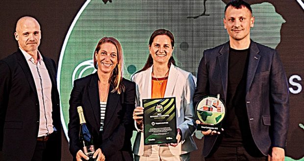 TourCompass-teamet ved prisoverrækkelsen, fra venstre Peter Frier Bak (CFO), Rikke Holm (Director Airline Operations & Partnerships), Elisabeth Simonnæs (Sales Manager) og Dino Karalic (CMO) PR-foto.