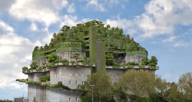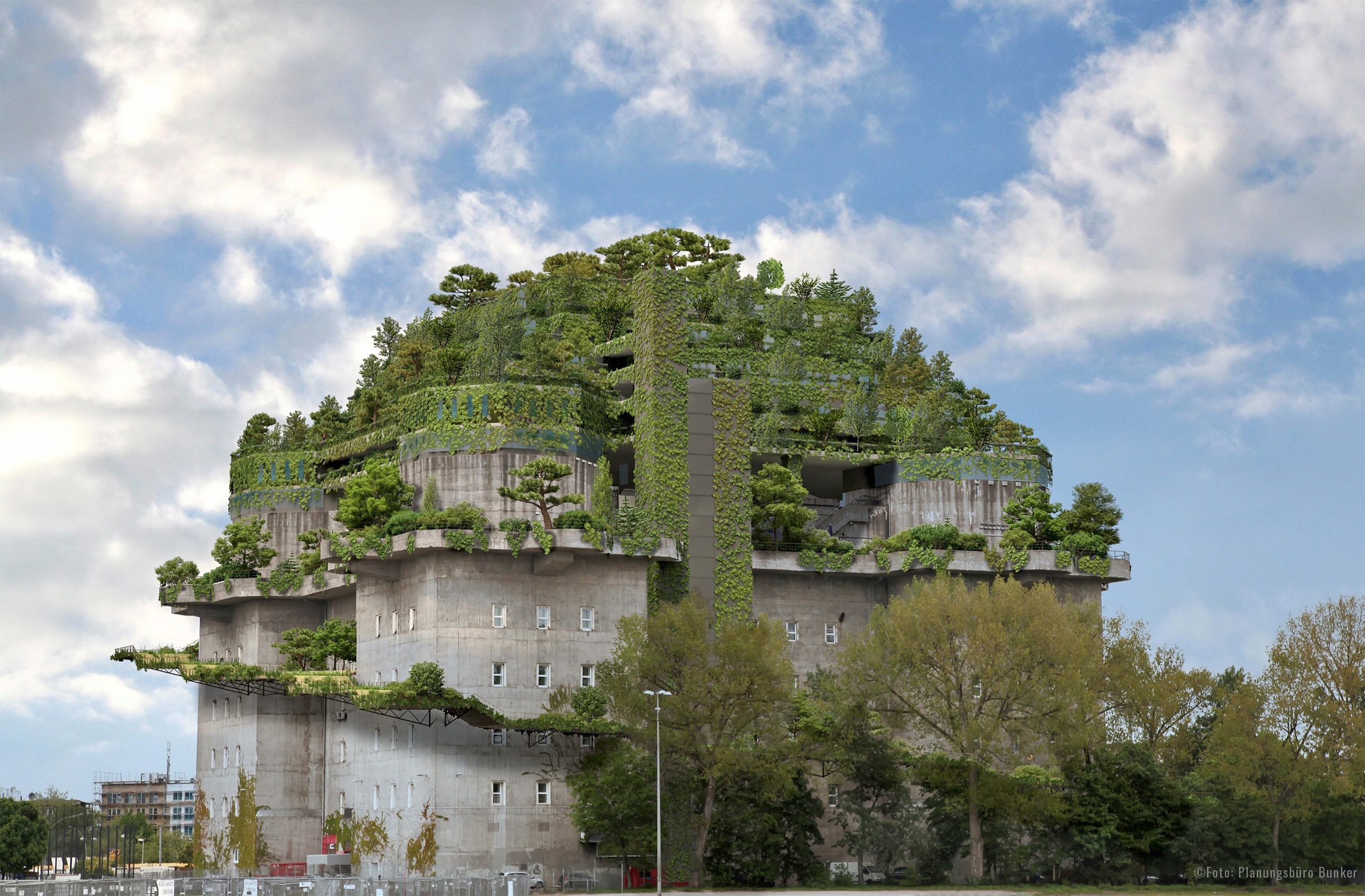 De seneste år er bunkeren udvidet og forvandlet, og vokset med 20 meter. Fem nye etager tårner sig op over den grå betonblok til i alt 58 meters højde, og med kraner er der løftet over 20.000 træer, buske og planter op på toppen.
