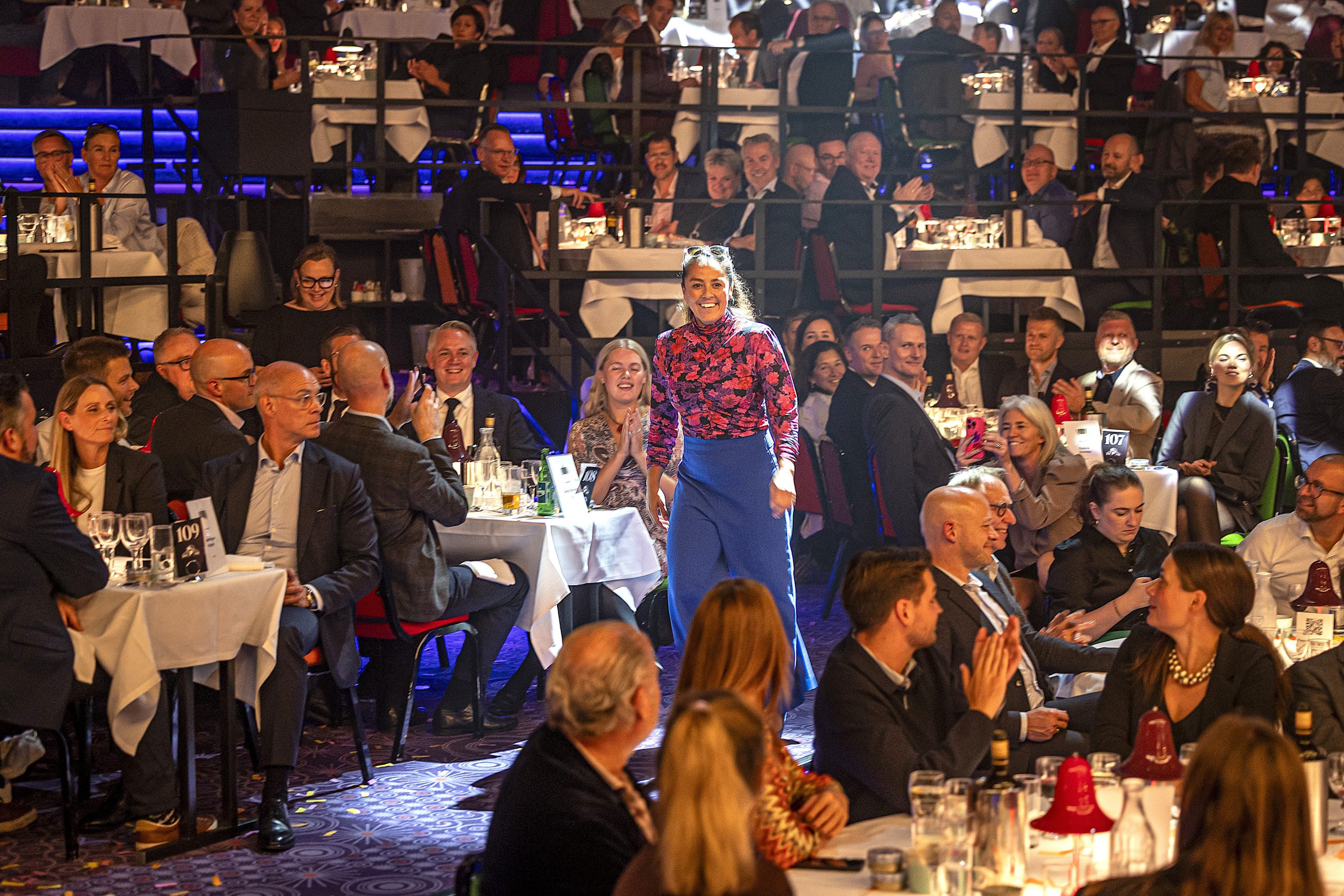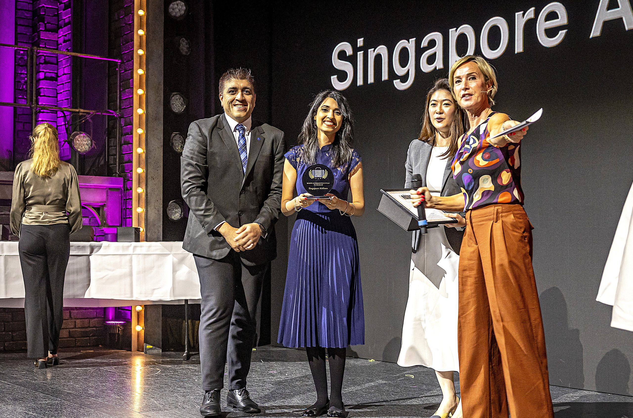 Klik for stort format. Natasja Crone fra TV 2 var igen konferencier ved Danish Travel Awards. Hér peger hun delegationen fra Singapore Airlines, vinder af bedste interkontinentale flyselskab, i retning mod fotograf Michael Stub, der også i år var officiel fotograf.
