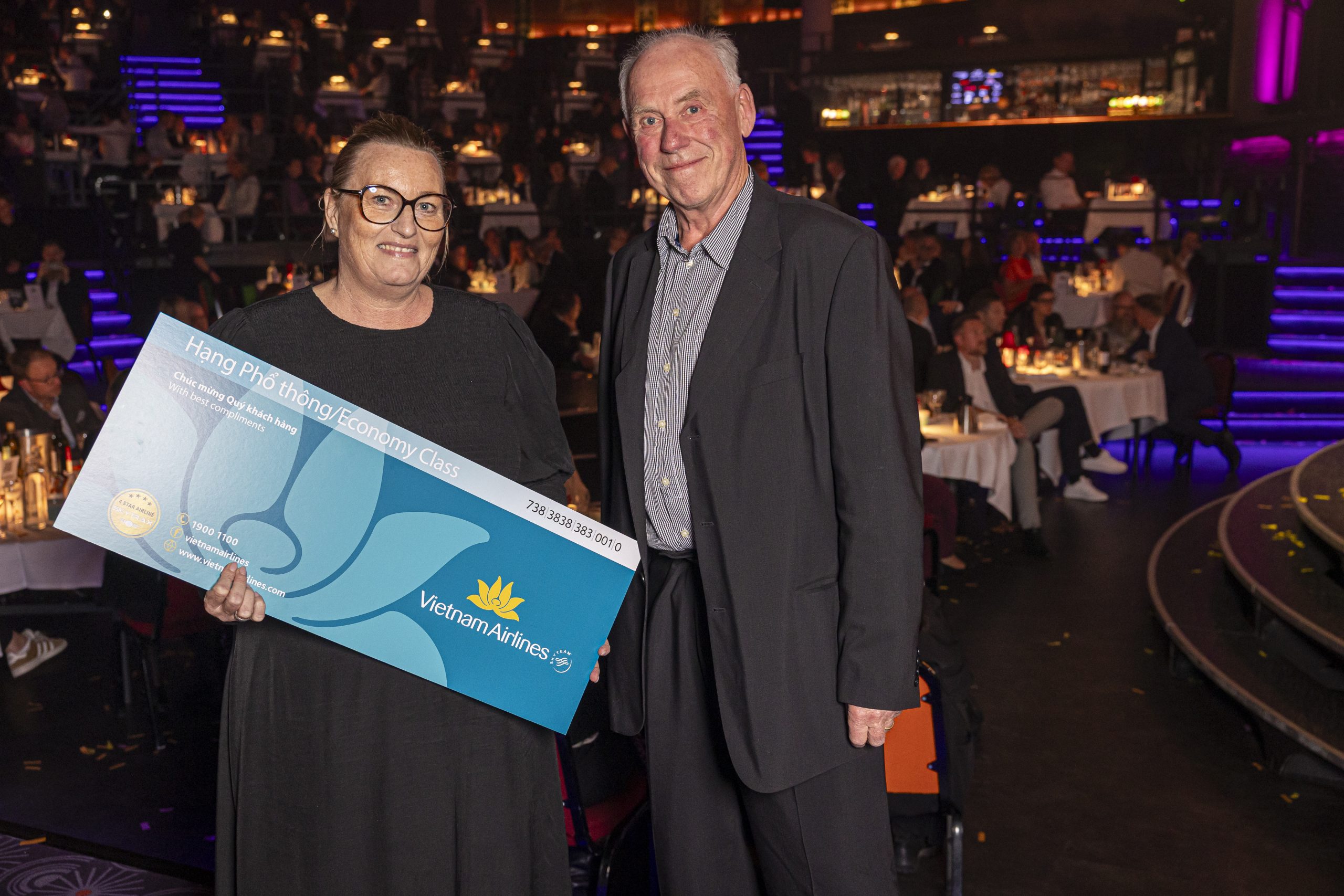 Klik for stort format. Vietnam Airlines, der til december åbner fra Ho Chi Minh City til København, havde sat to billetter til ruten til lodtrækning blandt DTA-gæsterne. Heidi Gammelby Knudsen, meetingdesignerchef hos Comwells Keller Park vandt og fik gavekortet overrakt af Göran Hansson, direktør for APG Nordics & Baltics, nordisk repræsentant for Vietnam Airlines.