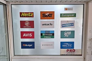 Klik for større format. Biludlejningsselskaberne i Færøernes lufthavn. Arkivfoto: Henrik Baumgarten.