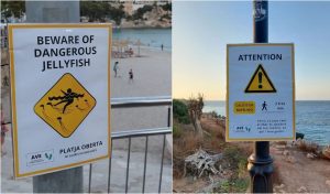 En af skiltetyperne skriver med store bogstaver på engelsk: “Beach Closed” og et badning-forbudt skilt. Men på samme skilt står der nederst det modsatte på catalansk: “Platja Oberta” (på dansk: Stranden er åben)