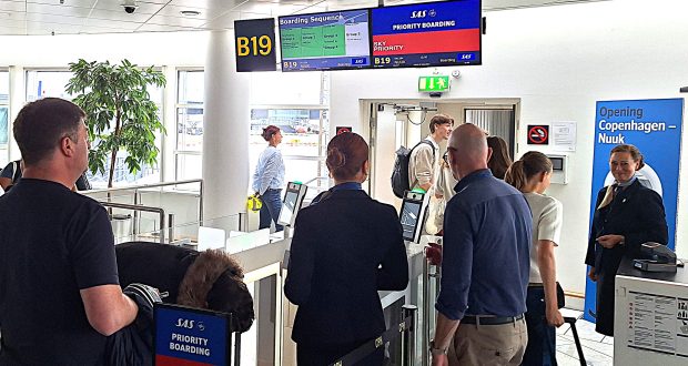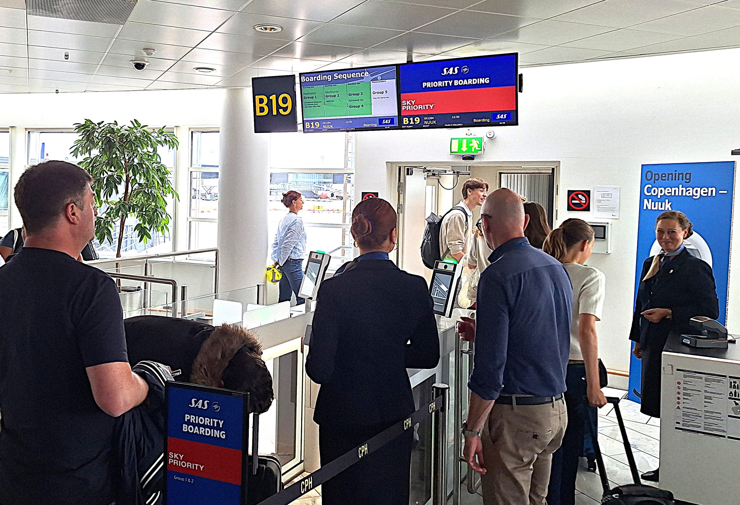 Fly til tiden. Passagererne boarder SAS’ premiereflyvning fra Københavns Lufthavn til Nuuk. Foto: Henrik Baumgarten.