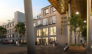 Klik for stor tegning. I midten af 2021 åbner det kommende hotel ved metrostation Femøren. Komplekset får udover hotel blandt andet også supermarked, ungdomsboliger og daginstitution, Illustration for Gefion Group: AI Arkitekter & Ingeniører.