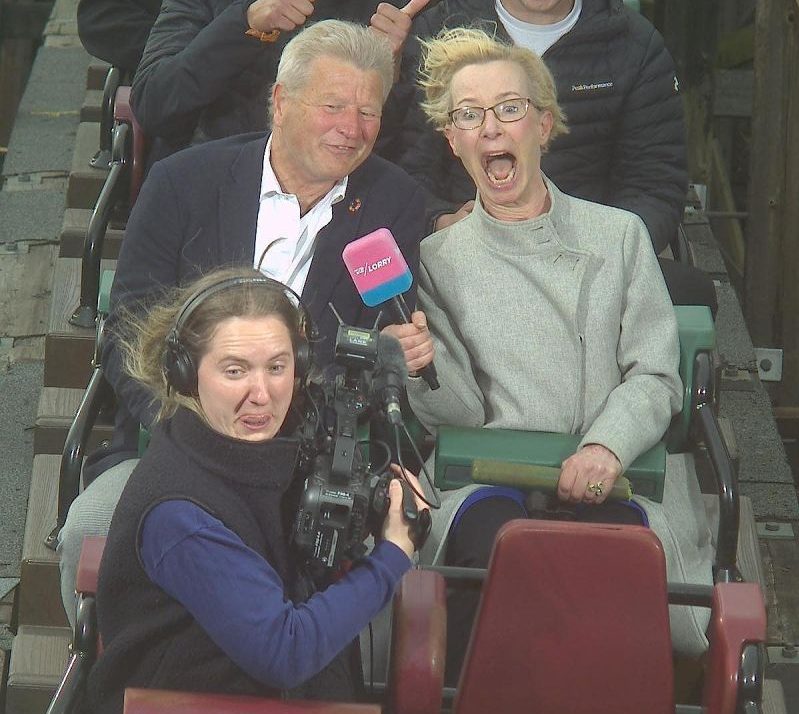 Klik for større format. Bakkens rutsjebane fejrer i denne uge 90-års jubilæum. Forleden var TV 2 Lorry på besøg. Her suser reporter Stine Sylvestersen og hendes fotograf afsted med Bakkens direktør, Ole Andersen. Foto: Bakken.