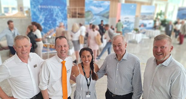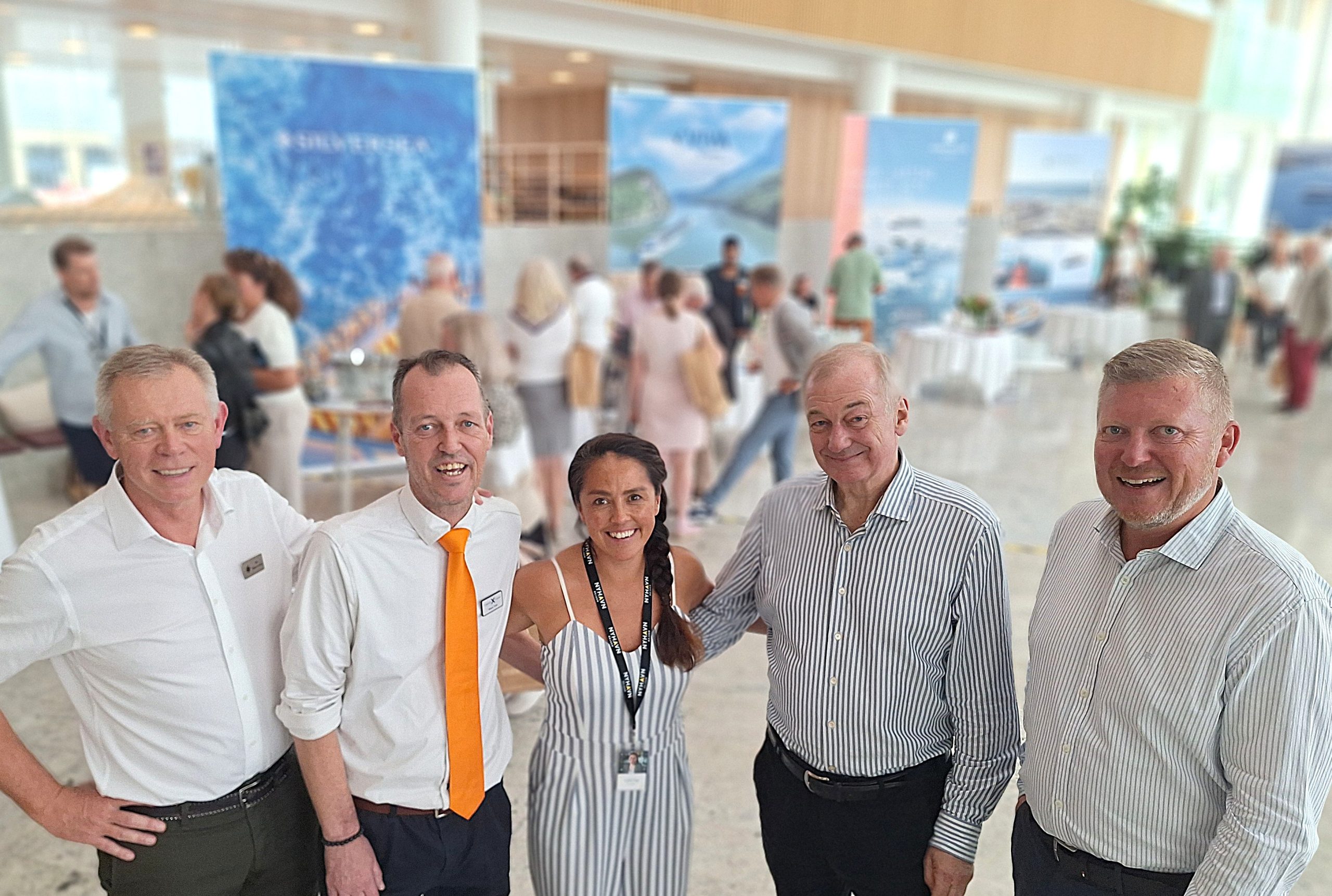 Fra Aller Leisure-bureauernes krydstogtmesse, fra venstre direktør Per Møller Jensen, Stjernegaard Rejser, Klaus Tøth, nordisk salgschef for Celebrity Cruises, bureauchef Carina Yong, Nyhavn Rejser, Jesper Boas Smith, partner i Gaia Travel, og Henrik Bergkvist, nordisk salgschef, Explora Journeys. Foto: Henrik Baumgarten.