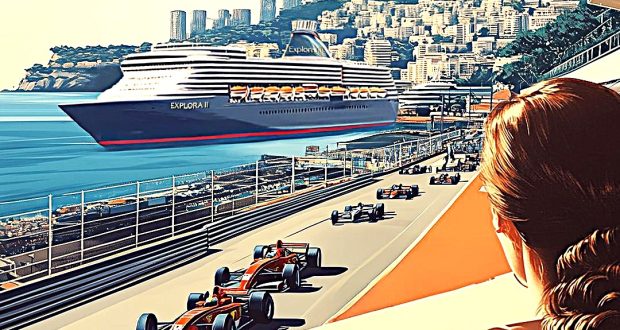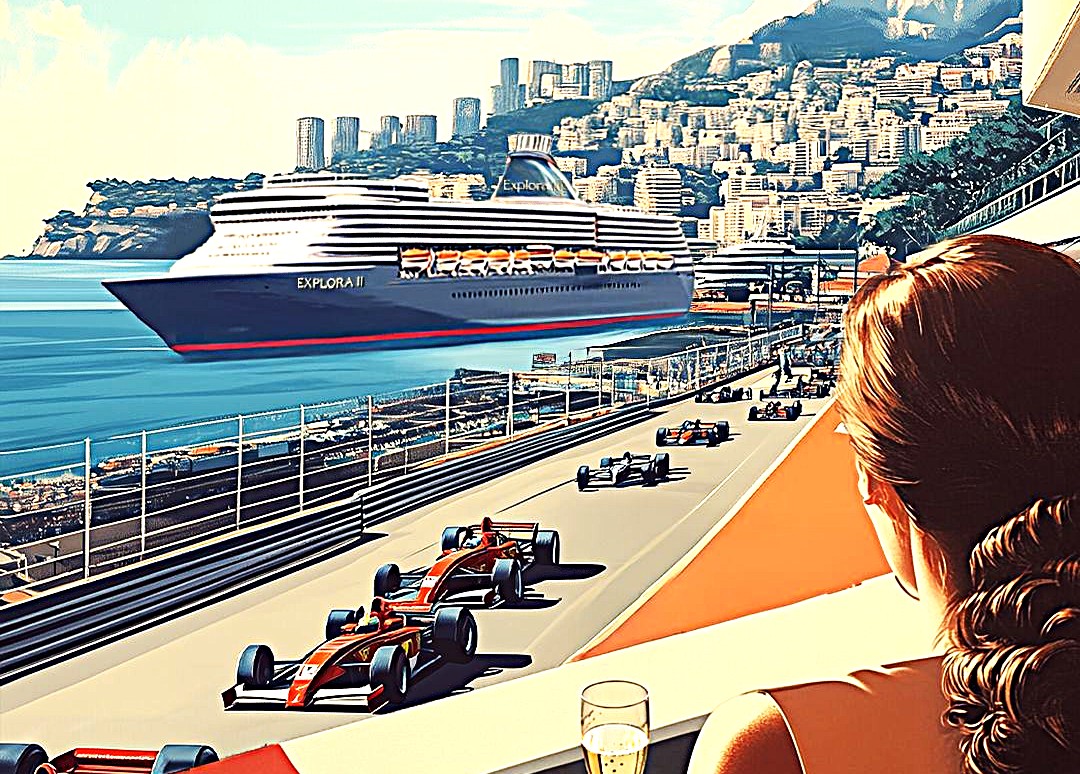 Explora Journeys har foreløbig to luksuskrydstogtskibe, her reklame for at ét af dem næste måned parkeres ved havnen i Monaco i forbindelse med den årlige Formel 1-løb. PR-illustration.