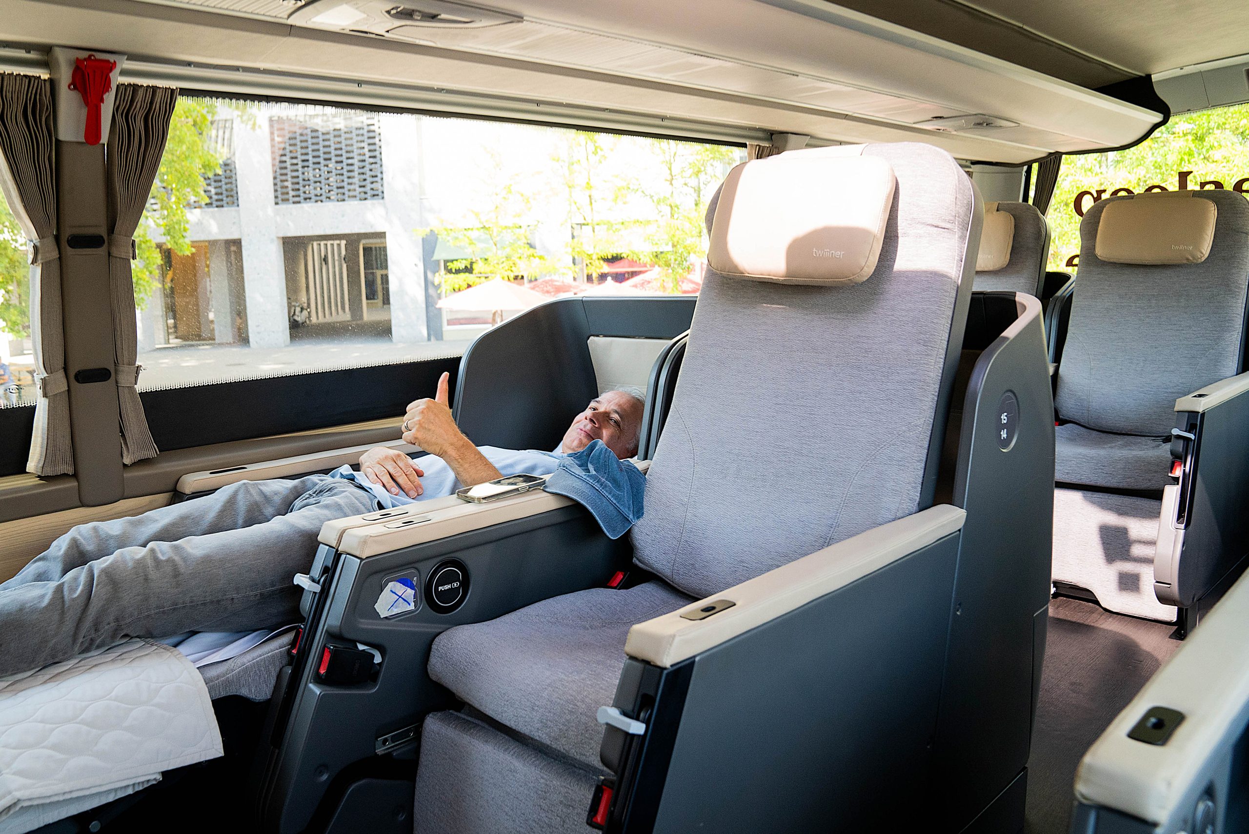 Sæderne i dobbeltdækkerbusserne kan omdannes til fladsenge som på flyenes business class. PR-foto.
