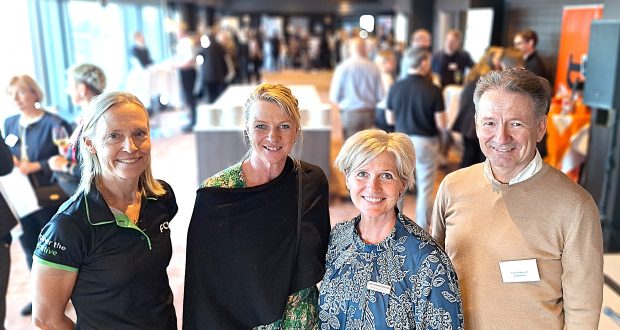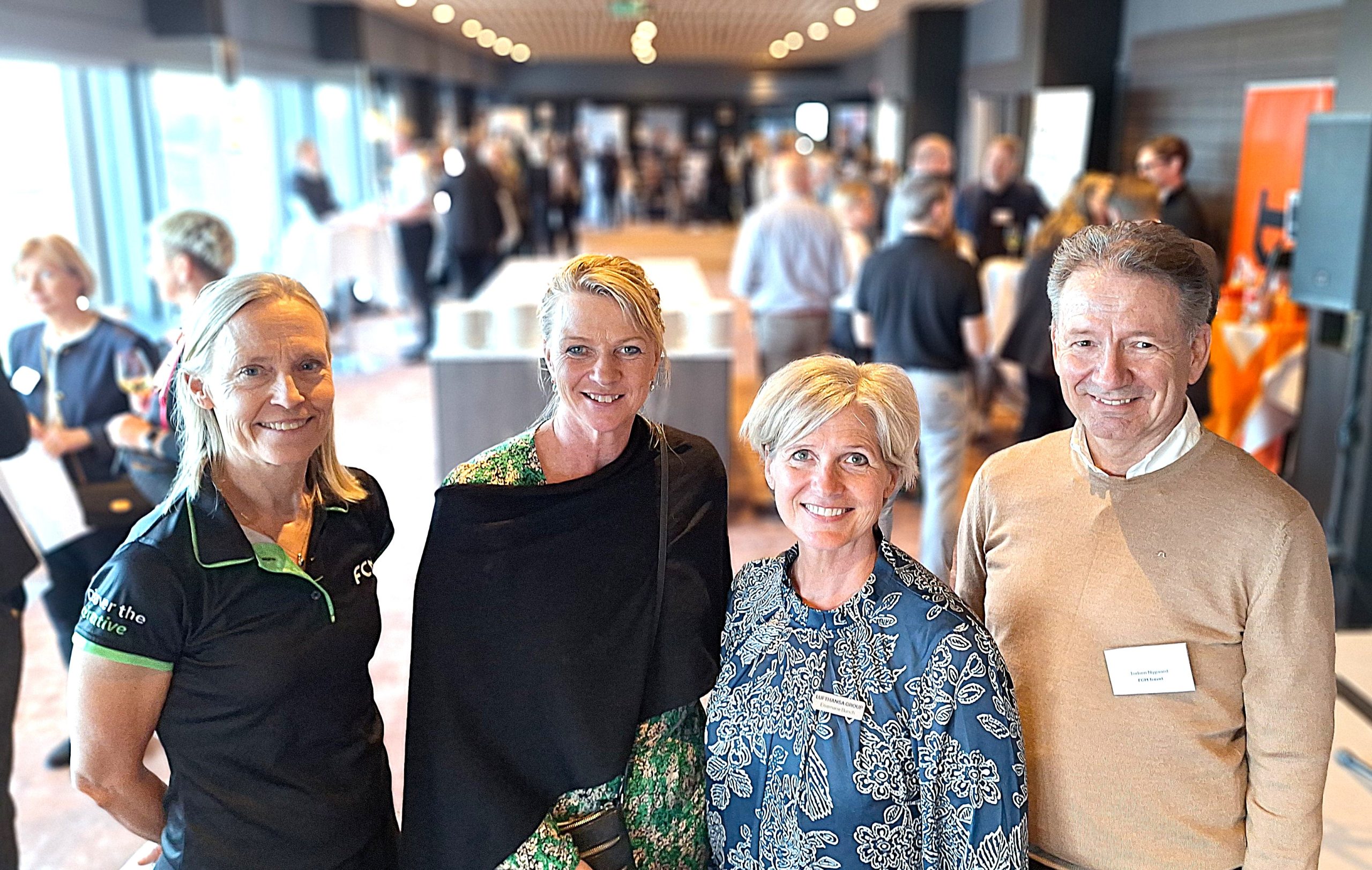 Fra FCM Travels jubilæumsreception. Fra venstre erhvervsrejsebureauets nordiske direktør, Bodil Månsson, fra kundekredsen Heidi Rønnest fra biotech-koncernen Symphogen, fra leverandørerne Else Marie Lemann Bunch fra Lufthansa-gruppen og FCM Travels landechef i Danmark, Torben Nygaard. Foto: Henrik Baumgarten.