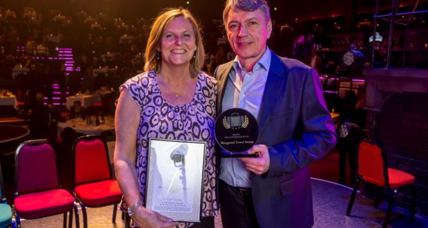 Hans Mangaard med en af sine nærmeste medarbejdere, rejsekonsulent Jennie Clinton, da Mangaard Travel Group sidste år modtog Danish Travel Award-prisen som Bedste Erhvervsrejsebureau. Foto: Michael Stub.